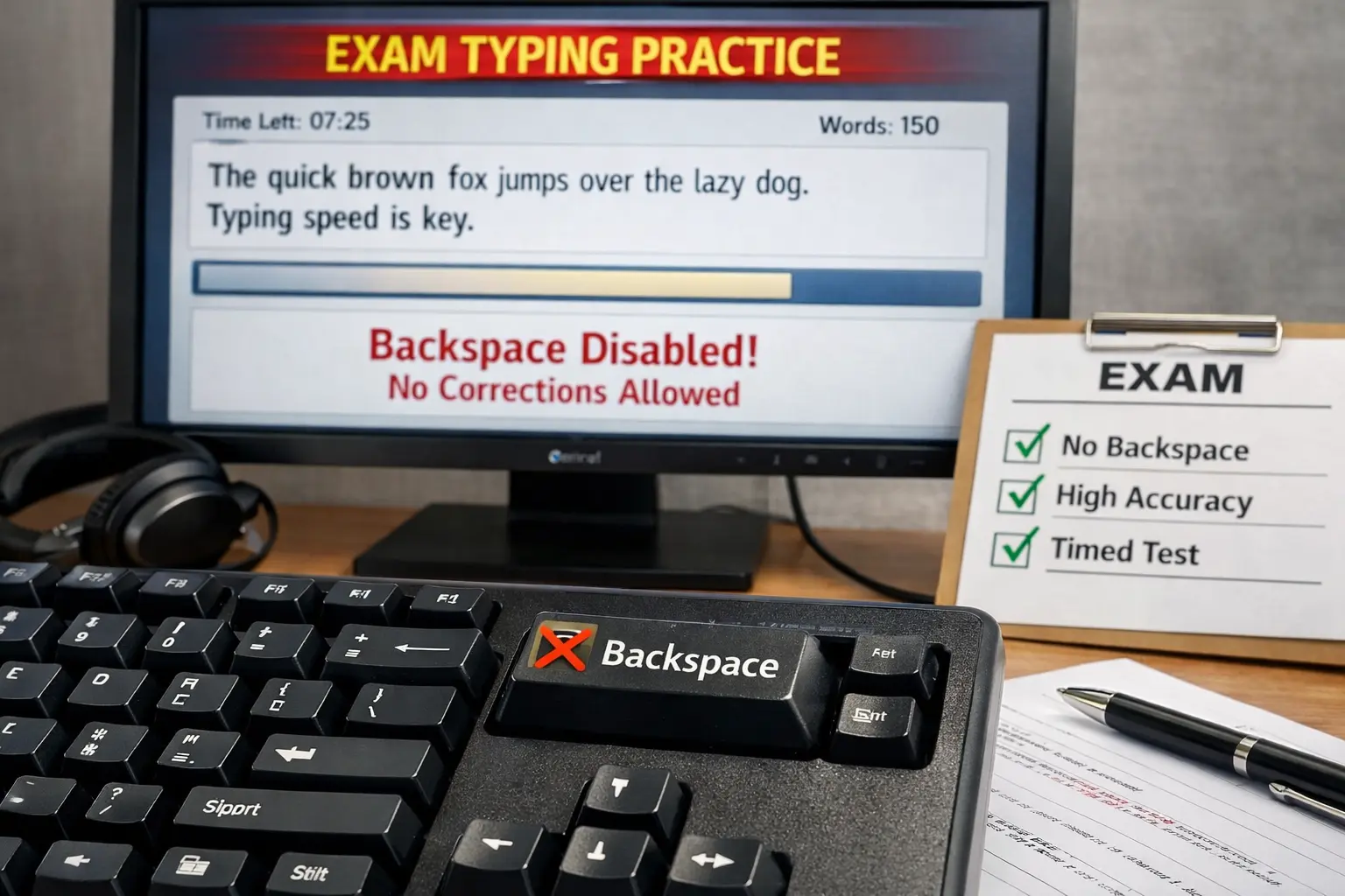 SSC CHSL, SSC CGL, Railway Typing Test, High Court Stenographer, UP Police Computer Operator जैसे लगभग सभी major exams में backspace key disabled रहती है। इसका साफ मतलब है कि एक बार गलत character type हो गया, तो उसे delete करने का कोई option नहीं होता। कई candidates अच्छी speed के बावजूद सिर्फ इस वजह से fail हो जाते हैं क्योंकि उनकी accuracy गिर जाती है।