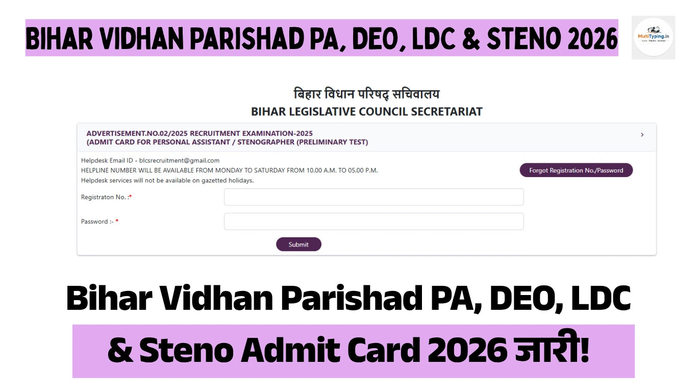 नमस्ते दोस्तों! मैं हूँ अमित कुमार और MultiTyping में आपका एक बार फिर से स्वागत है। दोस्तों, अगर आपने भी बिहार विधान परिषद् सचिवालय (Bihar Legislative Council Secretariat) में Personal Assistant (PA), Data Entry Operator (DEO), Lower Division Clerk (LDC) या Stenographer के पदों के लिए फॉर्म भरा था, तो आपके लिए एक बहुत बड़ी और शानदार खबर है!