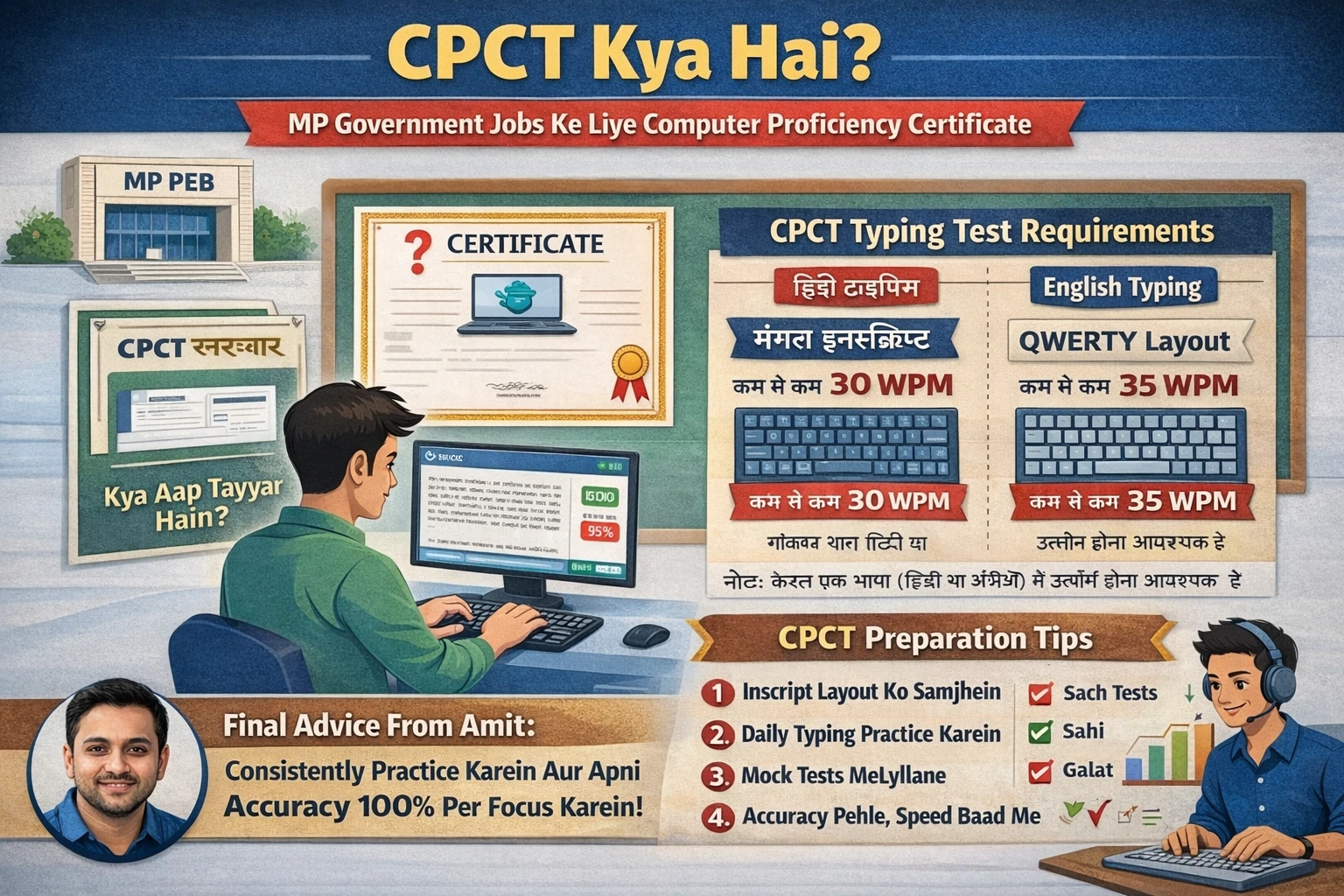 मध्य प्रदेश में सरकारी सेवाओं, विशेष रूप से क्लर्क, डाटा एंट्री ऑपरेटर, और सहायक ग्रेड-3 जैसे पदों पर करियर बनाने का सपना देख रहे युवाओं के लिए Computer Proficiency Certification Test (CPCT) को पास करना अब अनिवार्य हो गया है। मध्य प्रदेश व्यावसायिक परीक्षा बोर्ड (MP-PEB) द्वारा आयोजित यह परीक्षा केवल एक सामान्य टेस्ट नहीं है, बल्कि यह आपकी कंप्यूटर साक्षरता और टाइपिंग दक्षता का एक प्रमाण है जिसे राज्य सरकार की लगभग हर भर्ती में माँगा जाता है। इस परीक्षा का मुख्य उद्देश्य यह सुनिश्चित करना है कि सरकारी कार्यालयों में आने वाले कर्मचारी आधुनिक तकनीक और कंप्यूटर के उपयोग में पूरी तरह सक्षम हों। यदि आप अपनी तैयारी को सही दिशा देना चाहते हैं, तो आपको इसके कंप्यूटर सेक्शन के साथ-साथ हिंदी और अंग्रेजी टाइपिंग दोनों पर समान ध्यान देना होगा, क्योंकि कई विभागों में दोनों भाषाओं का ज्ञान अनिवार्य होता है।