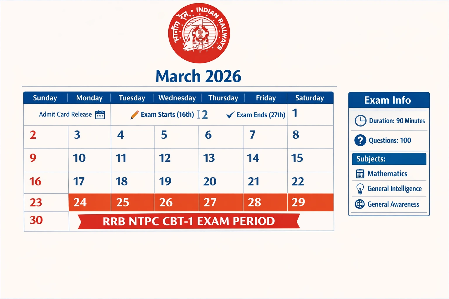 RRB NTPC CBT-1 Exam Dates: 16-27 March 2026