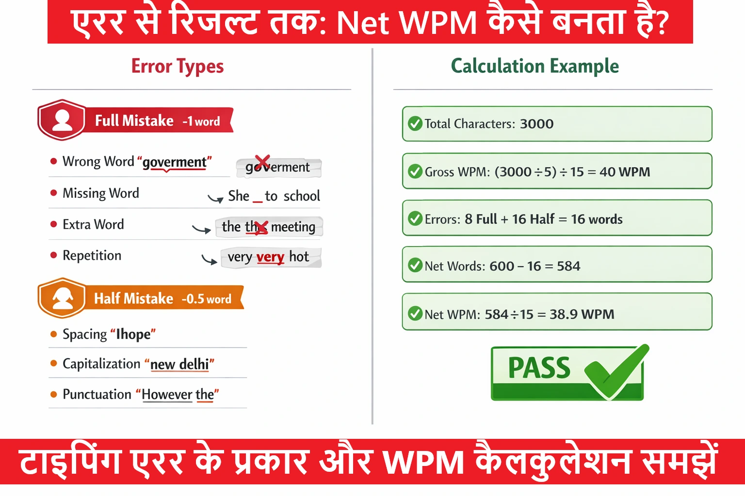 Example 2 (Danger Zone): Time: 15 minutes, Total characters: 3150, Full mistakes: 25, Half mistakes: 30। Gross WPM: (3150 ÷ 5) ÷ 15 = 630 ÷ 15 = 42 WPM। Total errors: 25 + (30 × 0.5) = 25 + 15 = 40 words। Net WPM: (630 - 40) ÷ 15 = 590 ÷ 15 = 39.33 WPM। यहां gross 42 WPM थी जो बहुत अच्छी लगती है, लेकिन errors ज्यादा होने की वजह से net 39.33 आई। Still pass है लेकिन margin कम है। Example 3 (Failure): Time: 15 minutes, Total characters: 3300, Full mistakes: 40, Half mistakes: 50। Gross WPM: 44 WPM। Total errors: 40 + 25 = 65 words। Net WPM: (660 - 65) ÷ 15 = 595 ÷ 15 = 39.67 WPM... रुकिए, calculation गलत हो गई। सही calculation: Total words from characters = 3300 ÷ 5 = 660 words। Total errors = 65 words। Net words = 660 - 65 = 595 words। Net WPM = 595 ÷ 15 = 39.67 WPM। Actually यह pass है। लेकिन अगर errors थोड़ी और बढ़ जाएं (50 full + 60 half = 80 total errors), तो net WPM = (660 - 80) ÷ 15 = 38.67। Still pass, but very close। और अगर 60 full + 70 half = 95 errors, तो net = (660 - 95) ÷ 15 = 37.67। यह भी technically pass लेकिन बहुत risky।