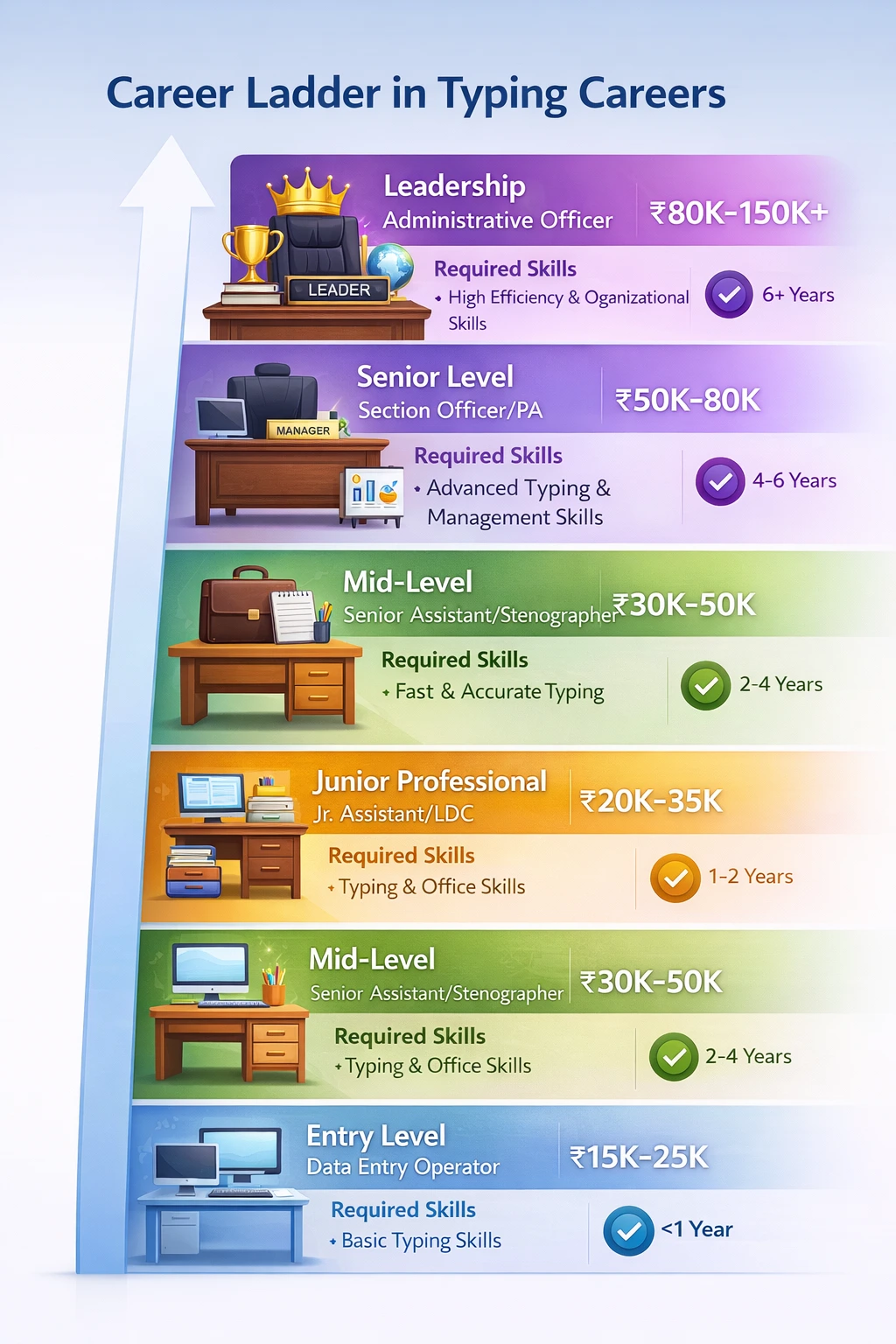 हाँ, बहुत अच्छी growth opportunities हैं। Government में: LDC → UDC → Assistant → Section Officer → Under Secretary। Stenographer → PA → Private Secretary। हर promotion के साथ ₹10,000-30,000 salary increase। Private sector में: Data Entry → Senior DE → Team Leader → Process Manager। BPO में 2-3 years में managerial positions तक पहुंच सकते हैं। Freelancing में: Rate increase, premium clients, specialized services। साथ ही lateral moves possible हैं - typing से administrative, content, या management roles में।