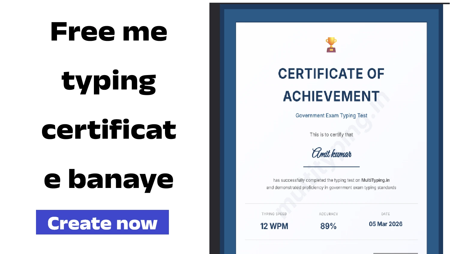 दोस्तों, मैं अमित कुमार हूँ और आज मैं आपके लिए एक बहुत ही मज़ेदार और काम की चीज़ लेकर आया हूँ। जब हम महीनों तक टाइपिंग की प्रैक्टिस करते हैं और हमारी स्पीड 30 WPM से 40 या 50 WPM तक पहुँच जाती है, तो अंदर से एक अलग ही खुशी होती है, है ना? मन करता है कि अपनी इस अचीवमेंट को अपने दोस्तों, फैमिली और सोशल मीडिया (WhatsApp status, Facebook, LinkedIn) पर शेयर करें। लेकिन सिर्फ 'मेरी स्पीड 45 है' बोलने से मज़ा नहीं आता, अगर उसका एक शानदार Typing Certificate मिल जाए, तो बात ही कुछ और है!