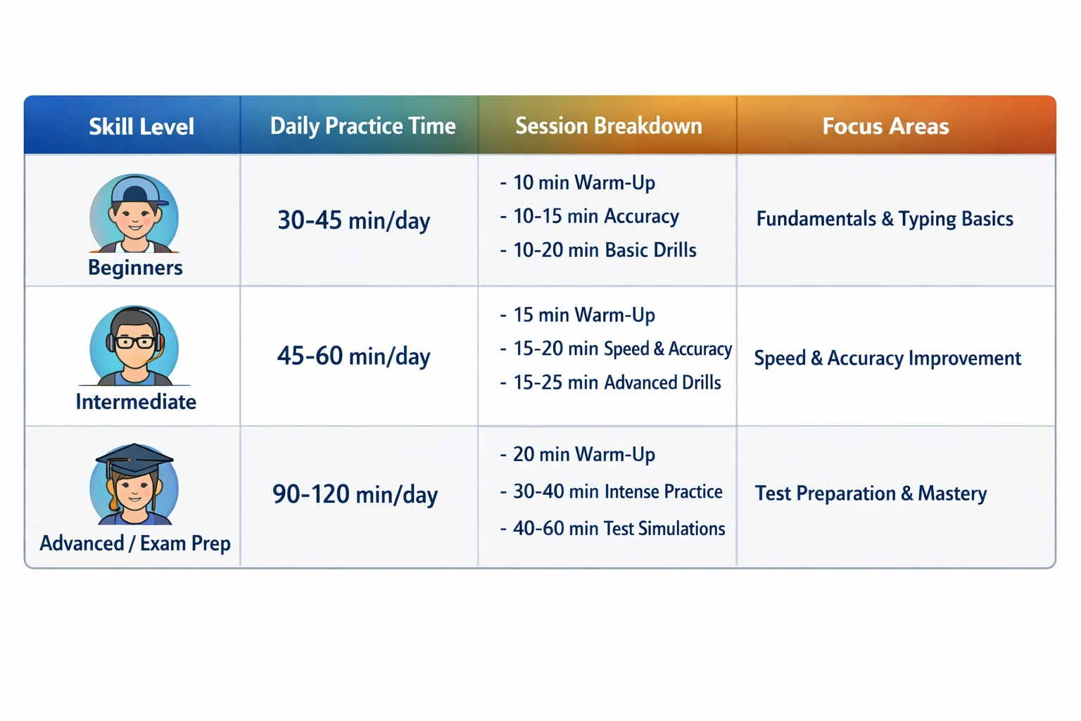 अगर आप advanced level पर हैं (35+ WPM) या फिर government exam की तैयारी कर रहे हैं, तो आपको serious और intensive practice की जरूरत है। इस stage पर आपका daily practice time होना चाहिए 90 मिनट से 2 घंटे। हाँ, यह काफी time है लेकिन अगर आप professional level की speed चाहते हैं या exam clear करना चाहते हैं तो यह investment जरूरी है। लेकिन ध्यान दें - यह 2 घंटे continuous practice नहीं होगी। इसे break up करना होगा।