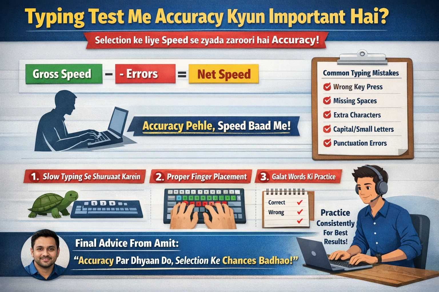 Typing test dene wale har candidate ka ek hi goal hota hai selection। Lekin yahan sabse bada role speed ka nahi, balki accuracy ka hota hai। Government aur competitive exams me net typing speed calculate hoti hai: Gross Speed – Errors। Agar aap 40 WPM type kar rahe hain lekin errors zyada hain, to aapki net speed bahut kam ho jaati hai। Isi wajah se hamesha kaha jaata hai – accuracy pehle, speed baad me। Mere personal experience (Amit) ke hisaab se jo students pehle accuracy par focus karte hain, unka selection chance kaafi zyada hota hai।